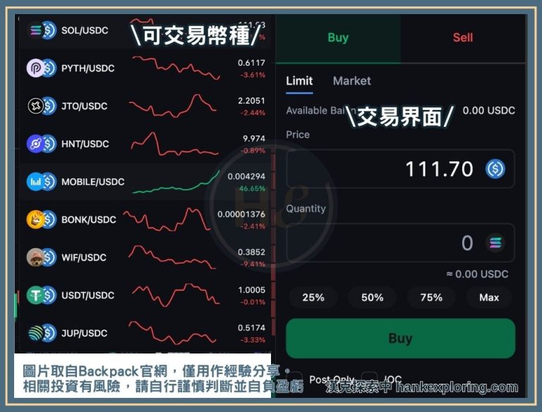 Backpack 已於近日開放測試版交易平台,你可以在上面以 USDC 交易 SOL 等幣種,而且交易界面蠻簡單的,只要輸入價格、數量就能下單,有點類似幣安買賣的閃兌功能,新手也能輕鬆上手。