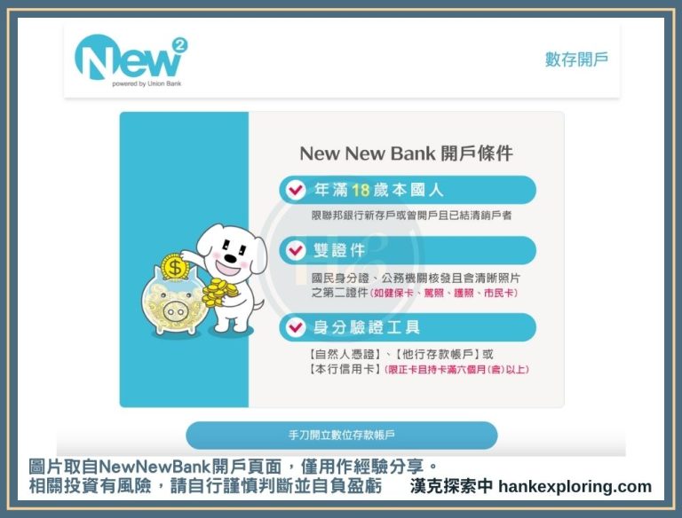 線上開戶的流程就是直接點開戶連結或下載對應的 APP,依照畫面指示依序填完資料就可以了,非常簡單。像上圖是 New New Bank 的開戶頁面,依照指示就能完成申請。