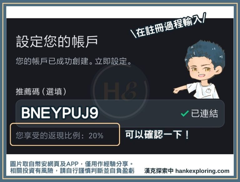 除非你只有建立合約帳戶,那麼可在幣安合約推薦碼輸入 hankexploring,一樣可以帶入手續費優惠。