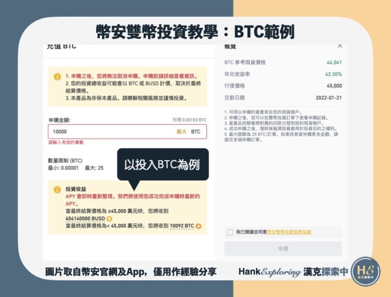 接著漢克直接以在幣安雙幣投資中,在預測BTC價格的雙幣投資商品中,投入BTC及USDT做舉例。