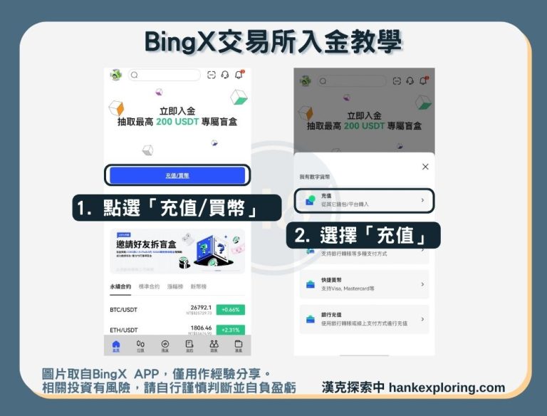因此,本篇我將以圖解方式,分享BingX出入金教學、如何以USDT購買BTC,以及我平常都怎麼使用BingX,最後整理出入金和購買BTC所需手續費等,希望能幫助探索者更全面的了解BingX!