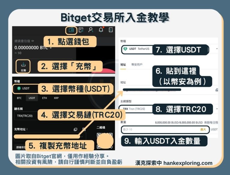| 加密貨幣充幣 | 將USDT從其他交易所轉帳到Bitget (EX. 幣安交易所出金) | 手續費可以很低 (USDT-TRC20) | 程序較多需熟悉 |