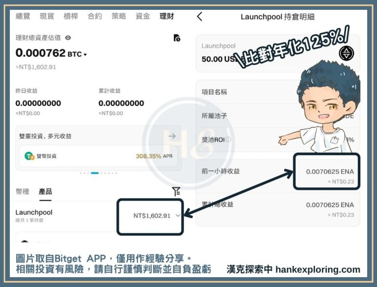 漢克實測 ENA 這檔活動,投入等值 1,600 台幣的 USDE 後,一小時能拿到 0.00706 顆 ENA 幣,換算價值約 0.23 台幣,等於年化報酬是 125%。