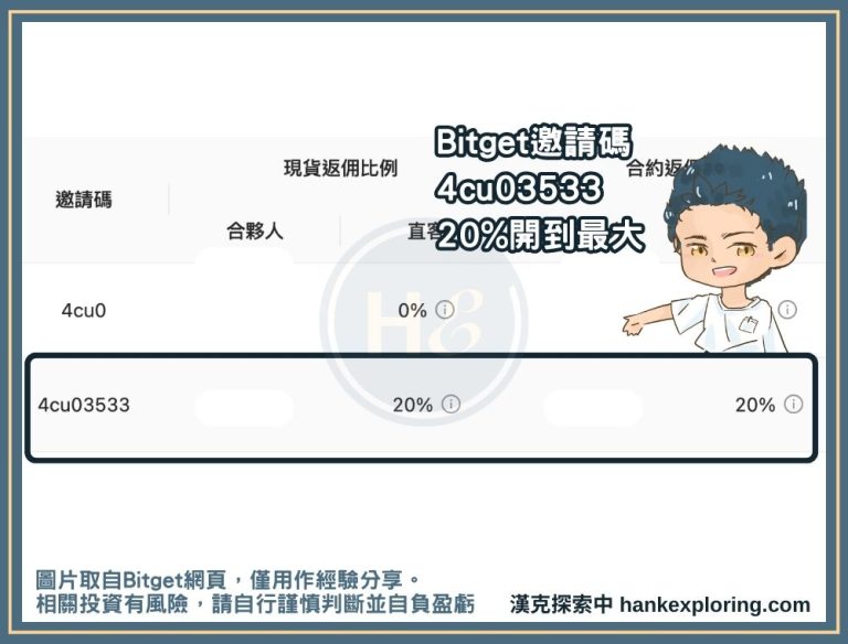 註冊 Bitget 時,在邀請碼欄位輸入 4cu03533,即可享有現貨合約交易手續費 20% 折扣、高達 1,000 USDT 的現貨手續費抵扣金、大量福利金等。別小看 20% 折扣,如果你手續費每月被收 3 萬元台幣,就等於現省 6,000 元!
