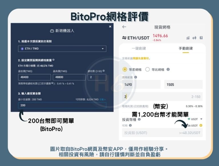 如上圖所示,漢克以市價1%左右當作上下限、設置最低網格數2格,左邊幣託網格僅需200元台幣即可建立網格機器人,右邊幣安現貨網格則需40 USDT(相當於1,200台幣),明顯幣託網格大勝。