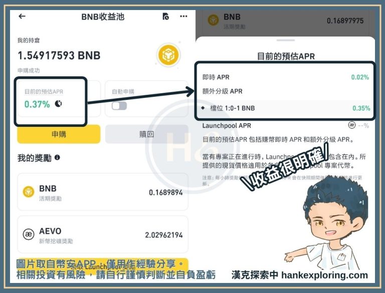 像上圖中你可以看到我總計有 0.37% 收益及額外的新幣獎勵,點開「預估 APR」也可以知道 0.37% 是由 0.02% 及幣安額外的分級獎勵 0.35% 組成。