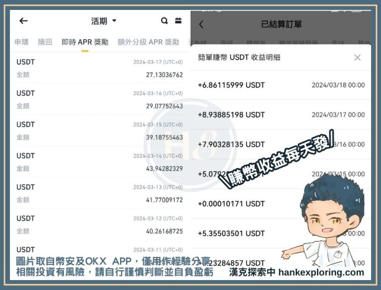 以我的經驗來說,我最常把 USDT 投入到幣安賺幣OKX 賺幣等產品中,因為在市場行情好的時候,年化收益可以來到 10% 甚至 20%,這可能比一些主動投資的工具收益都高!