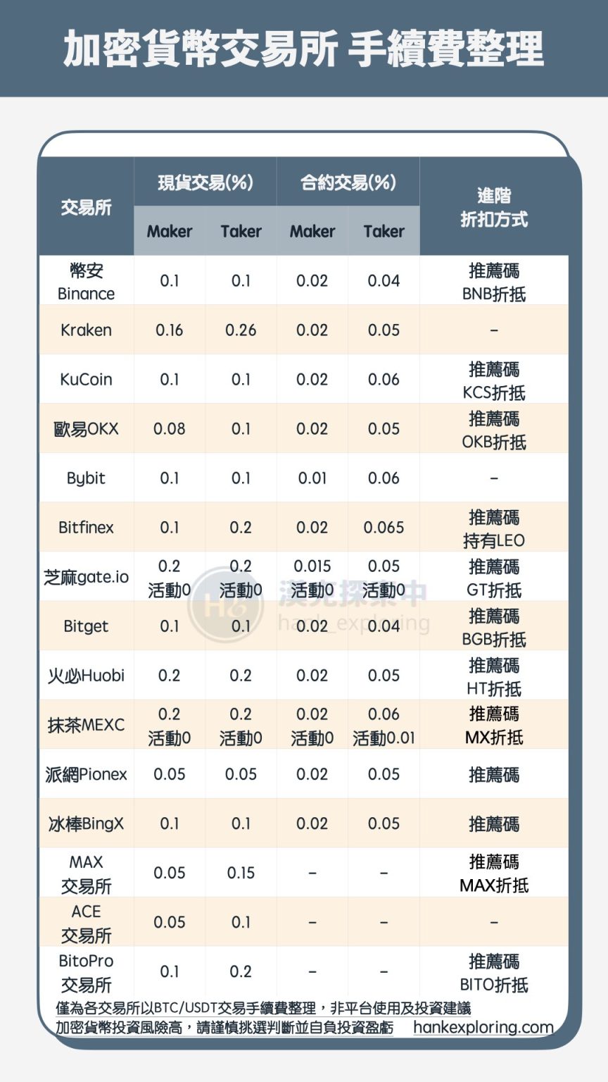 一般來說,手續費會依照交易金額的一定比例收取,買賣各收一次,買賣幣約0.1%左右,買賣合則為0.03%左右,且會依Taker、Maker而有差異: