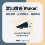 Maker就像是網購的賣家,提供各式各樣的商品讓人挑選,與Maker對應的Taker,則是逛網購的人,會把Maker的商品「取走」,當商品都被取走時,網購平台也不用活了。