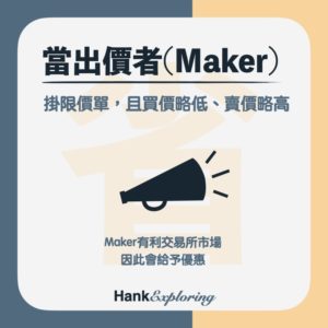 對交易所來說,當然希望越多人來這裡交易越好。而要人潮湧進,首先就是要有足夠的「賣家」,否則如果什麼商品都沒有,就不會有人願意來這裏逛網購了,因此交易所便常常會透過給予Maker更低的手需費優惠,來吸引大家當Maker。
