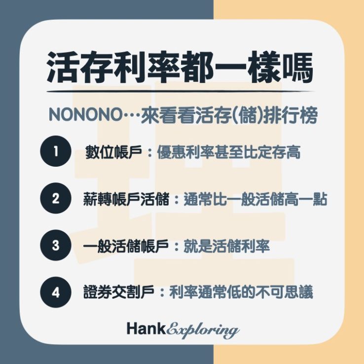 不同銀行的活存利率不一定一樣,且會依照銀行政策調整。就算是同一家銀行的活存(活儲),也會因為帳戶屬於不同的方案,而有不同的活存利率,漢克在此也列出四種常見的活存(儲)帳戶: