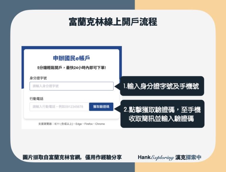 本篇將探索富蘭克林國民 e 帳戶的線上開戶流程,包含完整 6 步驟圖解,以及完成開戶後,該如何開始在富蘭克林國民 e 帳戶買基金(整個流程僅需透過網路即可完成)。同時漢克將示範富蘭克林買基金的兩種方法:單筆基金申購、理財機器人功能,希望能幫助探索者快速上手。