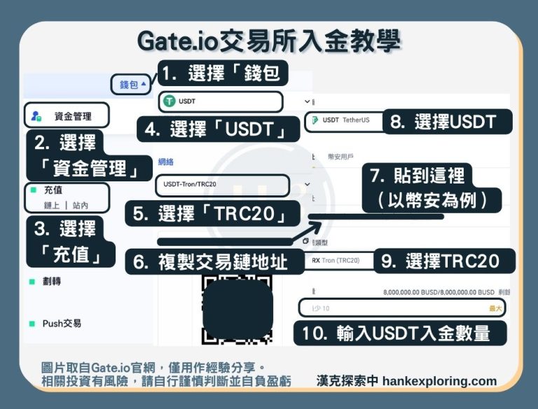 Gate.io交易所開戶後,接著就是要學會如何把資金放入Gate.io、用USDT買入BTC、以及如何把賺取的資金取出來!