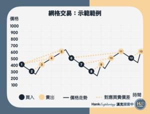 當漢克幣從400跌到300時,網格就會幫探索者以300買入一份漢克幣,同時在400的價格幫探索者掛一份漢克幣的賣出單。也就是當達到網格的指定價位時,就會依照漲跌趨勢以該價位賣或買一份漢克幣,同時在該價格向上或向下的指定價位掛一份買或賣單。現貨網格掛買賣單邏輯如下:
