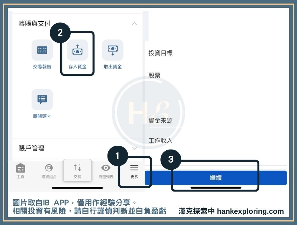 成功登入 APP 後,點擊右下角的「更多」然後找到轉賬與支付,列出的「存入資金」就是入金,按下去後會跳出探索者之前開戶輸入的個人相關資料,確認資料無誤就點「繼續」。