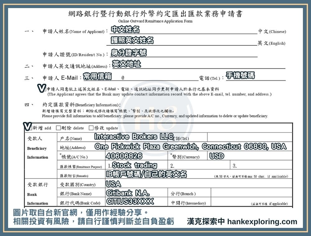 這裡以台新銀行匯款申請書為例,除了中文姓名的部分其餘皆需用英文填寫,證號就是身分證字號,通訊地址可以使用郵局網站中譯英功能,信箱與手機都確實填寫即可。