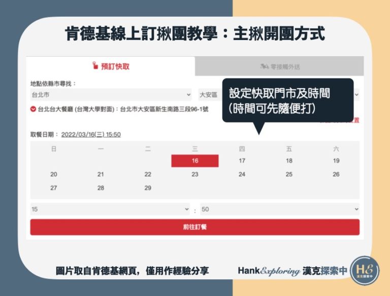 - 進入官網:點此進入肯德基官網,選擇要預約快取或是外送,以及要取餐的時間。