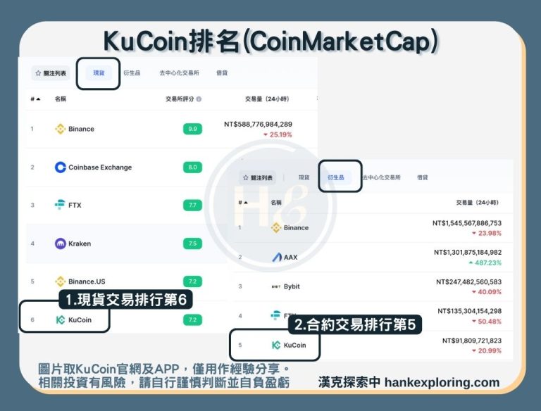 在加密貨幣交易所排名部分,KuCoin在CoinMarketCap的現貨排名為第5名、合約排名為第4名,屬於加密貨幣交易所的前段班。