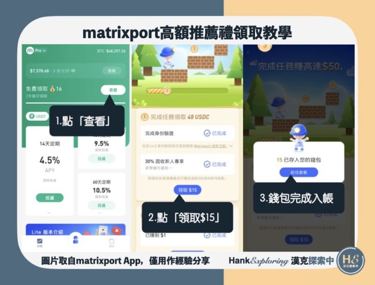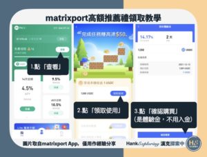 matrixport 邀請碼 Y3BVB7 可提供探索者1,288USDC的體驗金!漢克在本文也會圖解該如何逐一獲得這些優惠。