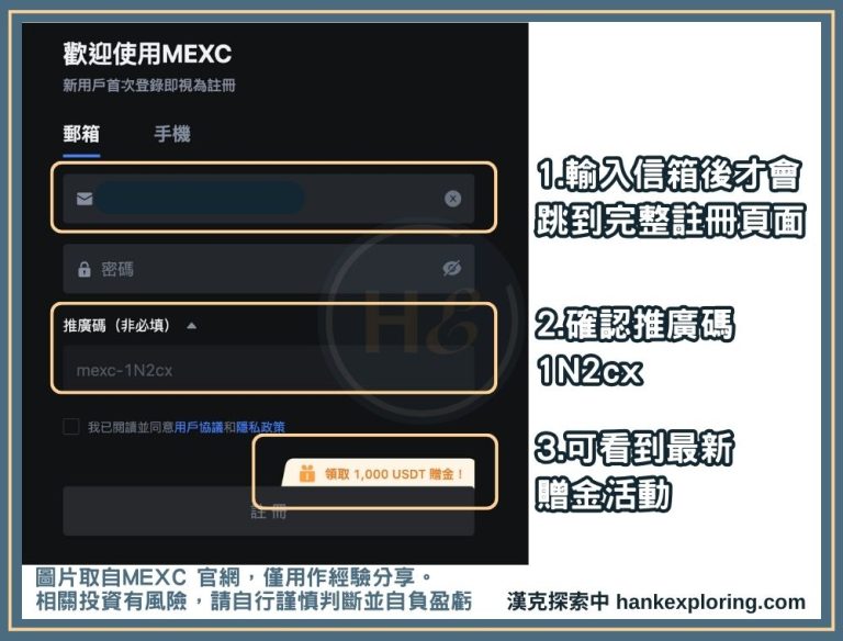 在註冊交易所時,使用推薦碼開戶只會有好處,特別是有與交易所進行合作的 KOL,獎勵通常會更豐厚。漢克在此整理幾個合作的交易所推薦碼,供探索者使用: