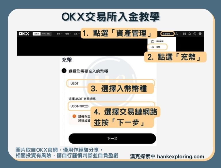 OKX交易所開戶後,接著就是要學會如何把資金放入OKX、用USDT買下人生第一顆BTC、以及如何把賺取的資金取出來!