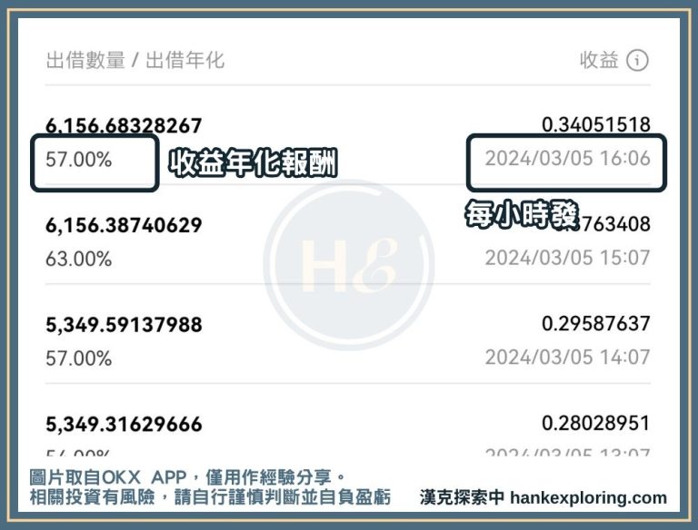 賺幣收益的算法,以圖片中 6,839.96 USDT 為例,是 6,838.96 x 44% /365/24 x85%。之所以要除以 365 再除以 24,是因為報酬是年化報酬,要換算成小時收益,而 85% 則是因為另外的 15% 是交給 OKX。