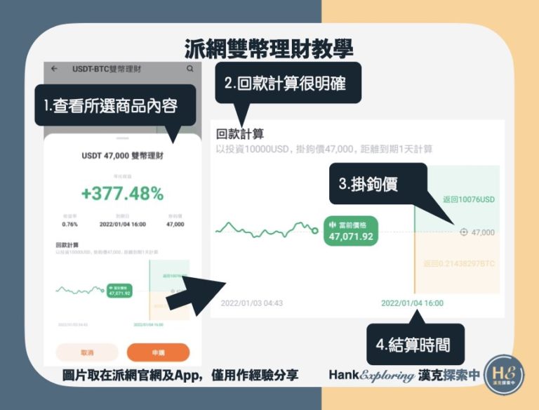 從上面這張圖可以看到,這個商品是「USDT-BTC雙幣理財」中的「USDT -47,000雙幣」,是漢克從「投USDT(基於BTC)」的選單中找到的。代表申購此商品需投入USDT,預測的幣價是BTC的價格,且掛鉤價(預期價格)是47,000(此價格僅為舉例,並非任何形式的建議)。