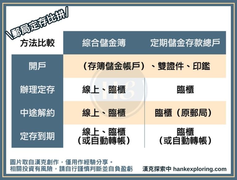 郵局定存前要先開立專屬帳戶,你可以擇一選擇綜合儲金簿、或定期儲金存款總戶。其中綜合儲金簿可透過網路、臨櫃辦理定存,定期儲金存款總戶則要臨櫃辦理,兩者差異重點如下圖。