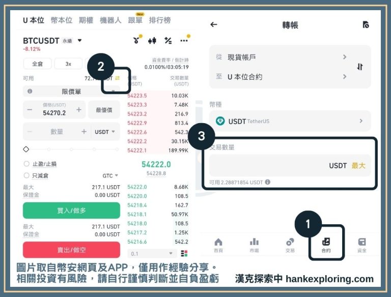 轉帳的方式是進到合約交易頁面,點擊上方的黃色雙箭頭,就可以把 USDT 從現貨轉到合約帳戶。
