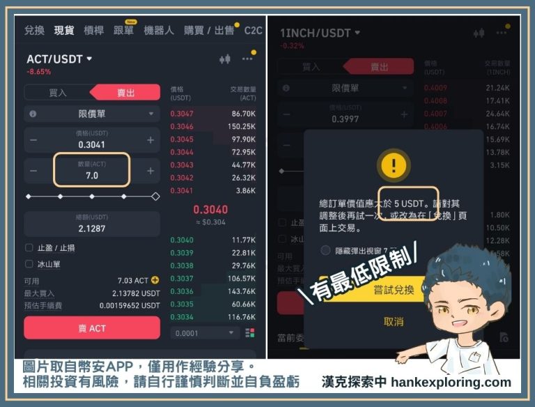 例如漢克想賣掉小數點後兩位的 ACT 幣,會發現連訂單都不能掛,因為系統支援的最小賣出數量是 0.1 顆。