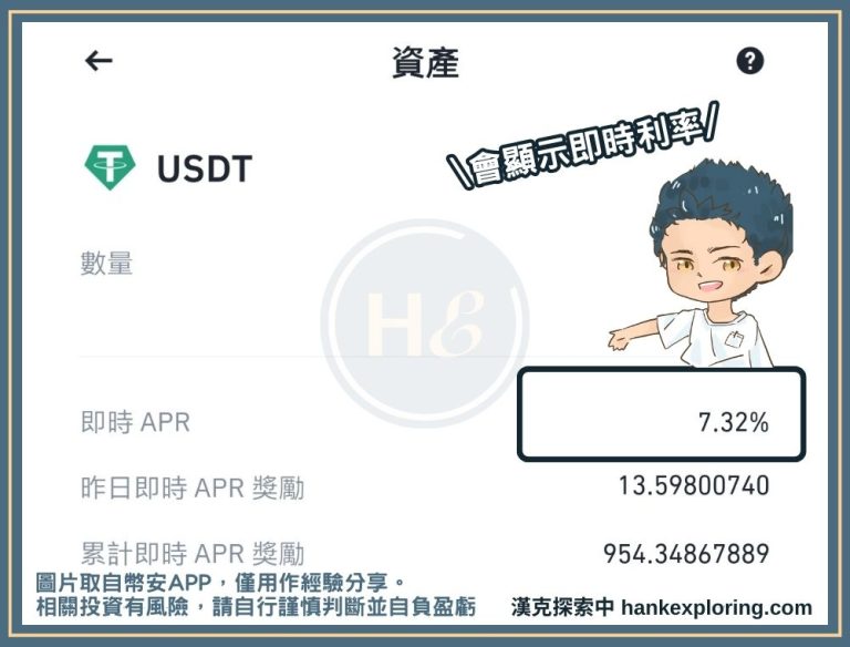 以往幣安還會提供「額外分級 APR」的收益,有點類似加碼優惠的概念,存入的幣在一定數量內會有額外收益。不過根據漢克實測,現在 USDT 已經暫時沒有了。