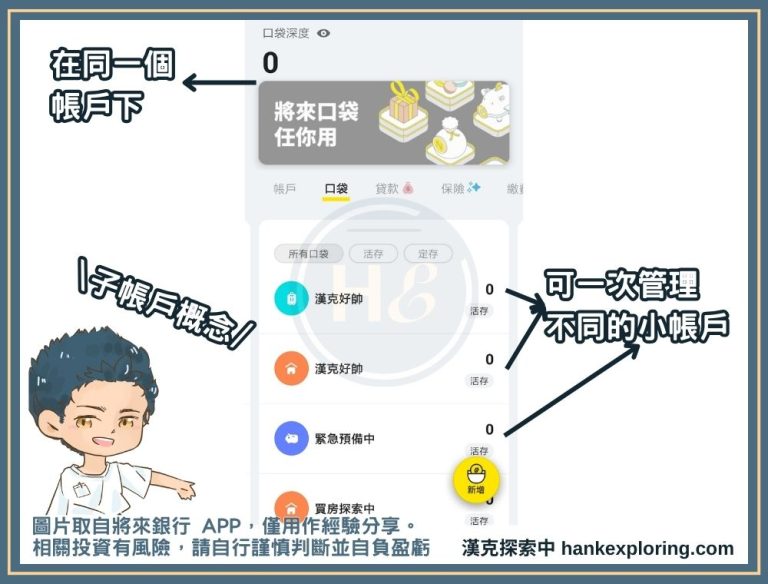 將來銀行口袋算是功能最少、活存優惠也很普通的子帳戶,唯一優點是創建方式很簡單,而且管理起來很直覺,像上圖你可以看到各子帳戶餘額排排站好,介面非常好看。