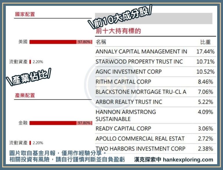 從前十大成分股來看,目前大多數都是以抵押房地產的不動產投資為主,風險算是相當集中,不過00712主要是依照市值、流動性等條件篩選成分股,找出有高股利收益特性之 mREITs,因此成分股組成會隨著未來市場變化而有所調整。