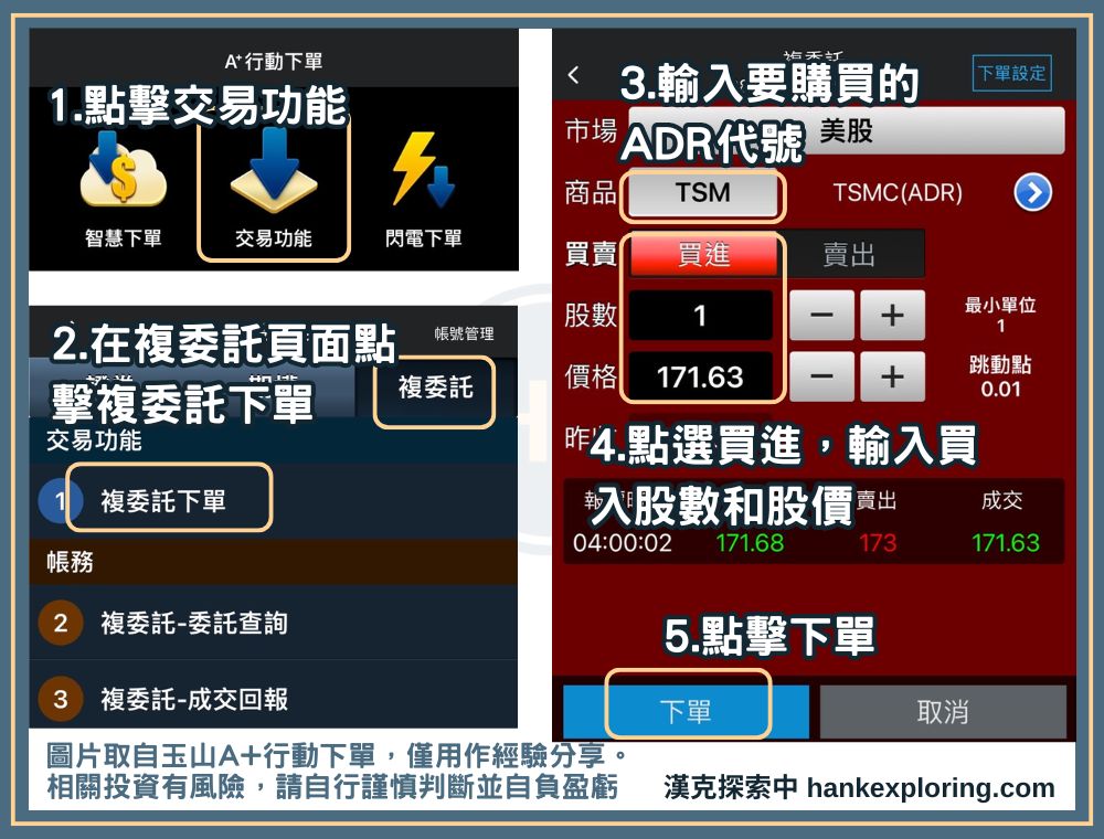 至於詳細購買方式,只要進到券商的複委託下單畫面後,在商品項目輸入要投資的 ADR 代號,就能看到對應下單介面。