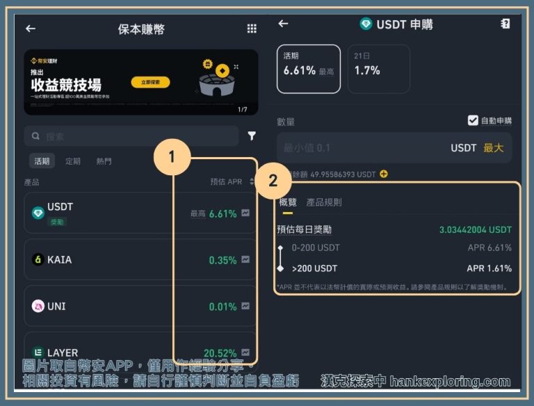 舉例來說,你在 USDT 賺幣產品看到的 6.61%,不代表投入一年一定可以拿到 6.61% 收益,一方面利率可能變動,二方面只有在 200 USDT 內才有 6.61%,超出的部分則是 1.61%。