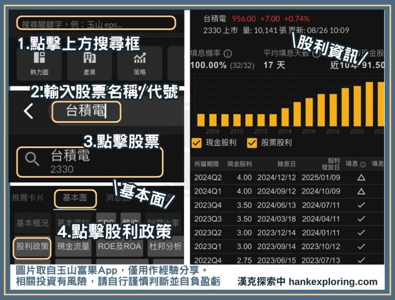 如果懶得額外查看頁面,只要進到券商的股票基本資訊畫面,並點擊股利政策,就能看到股票的當年度與歷年的股利資訊(下圖展示玉山富果的查詢方式)。