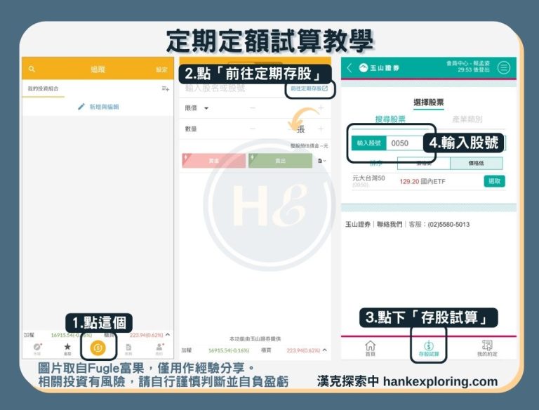 漢克在此也以玉山富果為例,示範定期定額的試算方式。