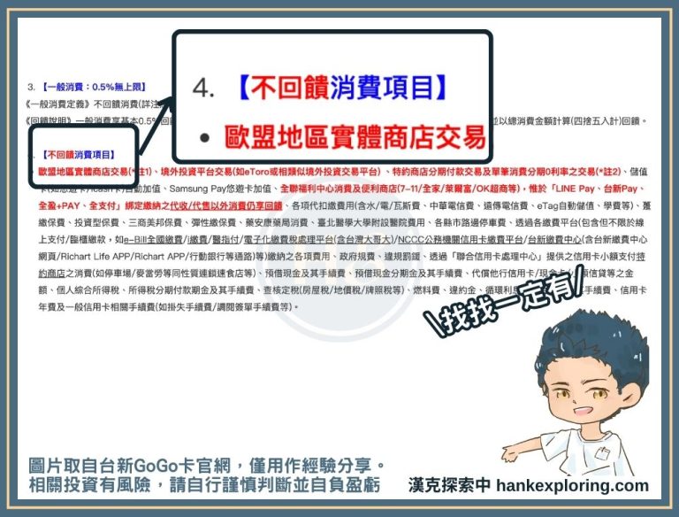 為了避免有人透過投資平台刷卡嚕回饋,或是造成錯誤的投資觀念,因此舉凡境外投資平台交易(如幣安交易所、eToro等)、基金交易及其手續費等,都不會有刷卡回饋。