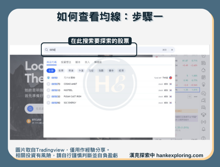 漢克在此以知名看盤工具Trading view,示範如何免費叫出0050的均線。