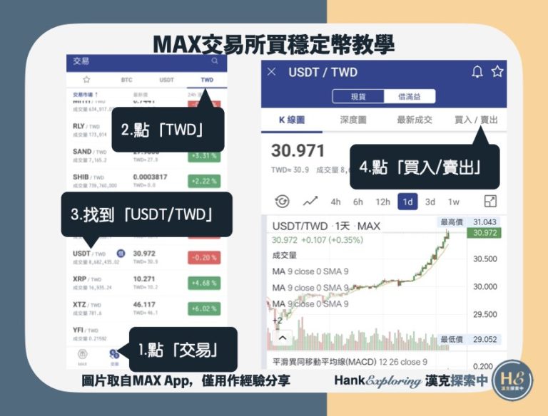 買穩定幣的方法很簡單,只要透過線上操作,5分鐘就能用銀行帳戶的台幣買到穩定幣,漢克在此以在台灣交易所MAX買穩定幣為例: